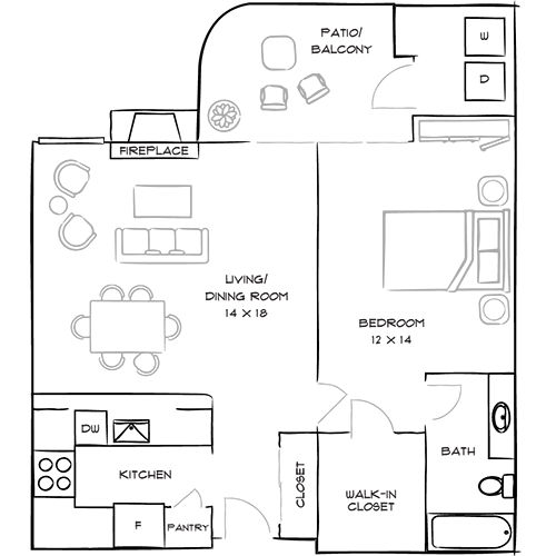 This updated 1-bedroom, 1-bathroom floor plan features a large central dining/kitchen area with a breakfast bar.